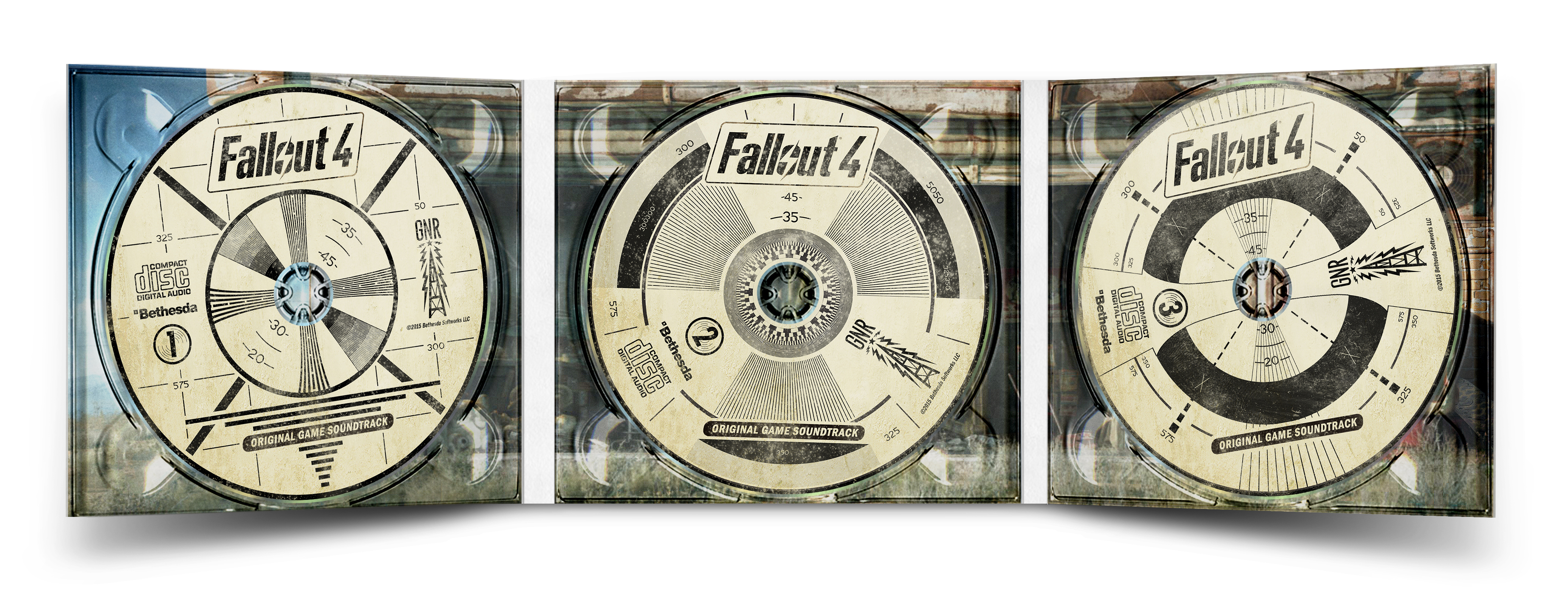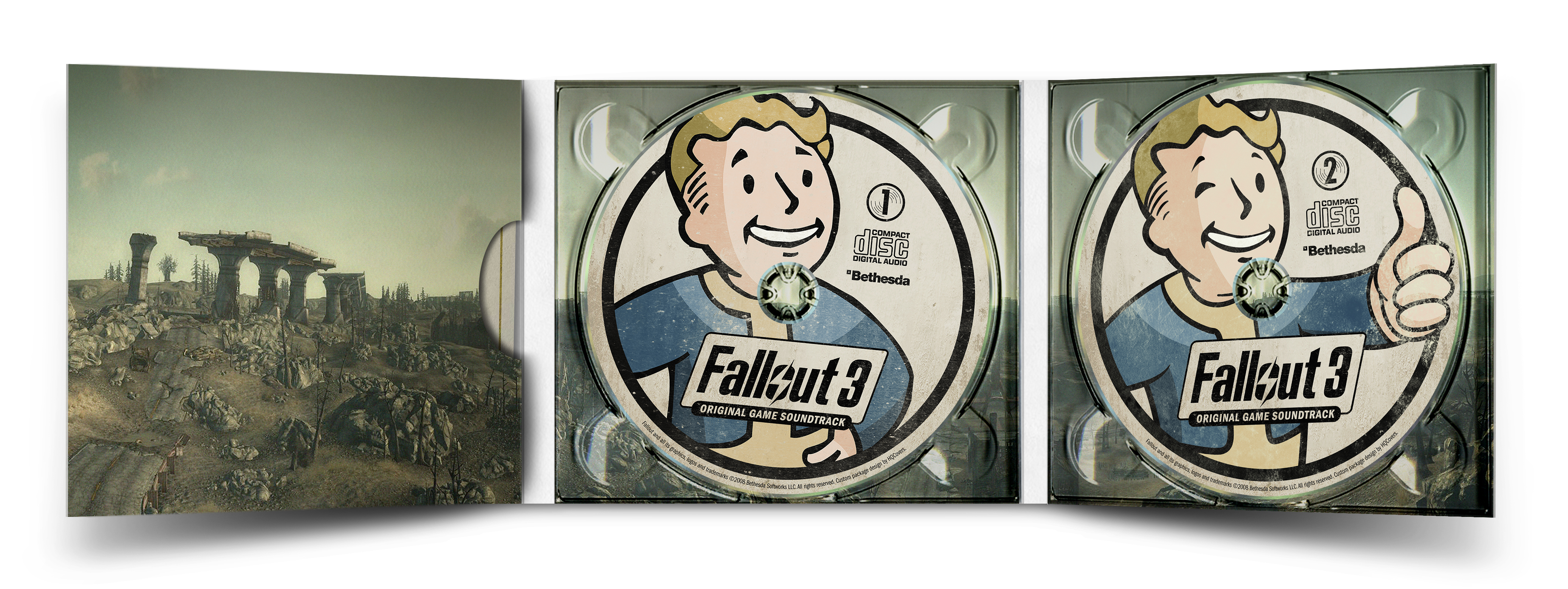 I modified an existing Photoshop mockup template of mine and turned it into this 6-panel-digipak set which opens up on both sides to reveal the three discs. This time around the majority of my time went into the three disc labels, which were pretty much work, but also a lot of fun. Disc 1 (#2) is an edited version of the widely known Indian-head test pattern, which Bethesda features so prominently within their game. I designed the remaining two discs in the same art style, so that in the end they would form a matching set (#2 to #4).