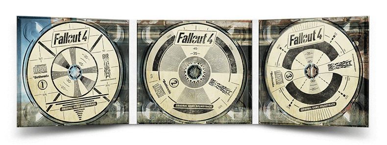 Recently a fellow cover designer encouraged me to come up with similar customs for the whole Fallout series. I wasn’t so sure about Mark Morgan’s soundtracks for the first two Fallout‘s, since those were entirely different games and the art design and even more so the available source material was fairly limited. But Fallout 3 and also Fallout: New Vegas were definitely worth a try, especially since I enjoyed working on Fallout 4 so much, the CD labels in particular.